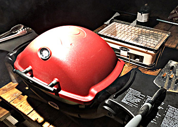 Two of our favorite food prep tools are without a doubt our grills - a Yakatori earthenware grill that we fire up with a small amount of charcoal to initiate a starter fire and then cover with chunks of oak, hickory or mesquite to get a healthy wood smoke taste. Our second grill a Weber Q1200 propane has two removable grids and a replacement solid cast iron griddle plate that we use for searing and sautéing fish, especially snapper or halibut, breakfast hash or dinner potatoes, bacon and pancakes. Grills move all the cooking fun outside and allow tasty feasts to be grilled without messing up or smelling out our Airstream.