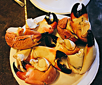 Expensive but delightful stone crab claws in the Florida Keys in various sizes, large - 4 to 5 per lb, jumbo - 3 to 4 per lb and colossal - 1 to 2 per lb! Stone crabs are caught locally, one claw is harvested, the crab is then returned to its habitat and three year later, lo and behold, it has a new claw!