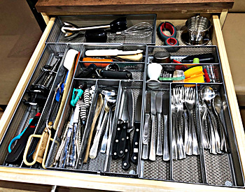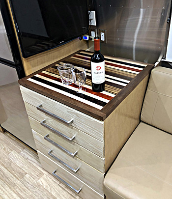 Top drawer contains all your go to gear essentials for kitchen prep. The immediate access to your utensils and tools makes a chef's work so much easier and allows for creative cooking normally quite restrictive in the Airstream original configuartion.