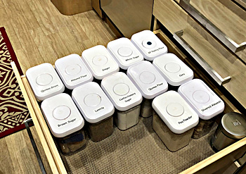 A compact mobile kitchen does require some serious planning! Reducing working counter space from 30 ft at home to 5 ft in the Airstream requires compromise! Taking a leaf from Ultimate Airstream’s expensive enhancements, we decided to build our own drawer cabinet storage unit providing 6 additional cubic feet of capacity (described in February 2019 newsletter) to give us the ability to bring our standard day to day ingredients in 15 OXO containers, a wide range of some 20 spices and rubs, and an array of kitchen tools and gadgets. We added an extra rack in the slide out pantry by relocating tall items, and built racks on the inside of the curved kitchen sink unit. A twelve bottle capacity rack was built into the base of our wardrobe cabinet and is stocked with wines, vinegars and oil bottles. Lastly, fridge organization was enhanced by buying perforated clear plastic storage boxes that allow the full shelf height to be maximized while keeping items secure under motion.