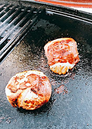 Easy prep on the Weber griddle: prosciutto wrapped scallops. Buying the right size scallop is important - too large they will not cook through sufficiently. Wrap in proscuitto and use a toothpick to hold the ham in place for a great appetizer or main course.