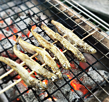 An experiment with very small smelt fish, seasoned with olive oil and salt, grilled on bamboo skewers in two minutes and eaten whole. Finding fresh smelt is hard but Berkeley Bowl market in Berkeley CA has it all!