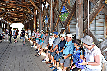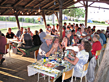 Welcome banner for the Quebec Unit 125 annual rally on the Saguenay Fjord – hence the Fjordmidable Rally title. ![]() Camped on the Saguenay River on the Anse-St-Jean cove for a week on 15 amp service. I was glad that I had fitted Micro Air to our AC unit as a couple of days heated up to uncharacteristically high temperature and our AC unit performed flawlessly. ![]() Quebec Airstream Unit 125 takes advantage of the shade in the covered bridge to rest on our historical tour of the Anse-St-Jean village. ![]() Eric Tremblay, local historian and descendant of the original 21 families to colonize the area, leads our tour. ![]() The micro brewery closed down for the evening in order to host our rally. The campsite was 100 ft away so no driving back to the Airstream was necessary! ![]() Sleek cruising and observation boat takes us up and around the fjord to admire the cliffs and scenery including the Virgin Mary statue. A thankful early settler returned to the Saguenay with his gift to the community and installed this 3.5 ton and 23 ft high Virgin Mary high on the cliff but it proved to be a daunting installation. ![]() The Quebecois banquet had plenty of style, matching place settings, napkins, glasses and enough wine for everyone. Lots of conversation, fellowship, an exciting three-hour four course local terroir dinner and animated story telling – in Quebecois! ![]() The Airstream rally provides the Quebec unit with the perfect occasion to feast and enjoy time together. Our evening banquet brought us all together in a friendly and convivual gathering that would be remembered as a special time for all. |